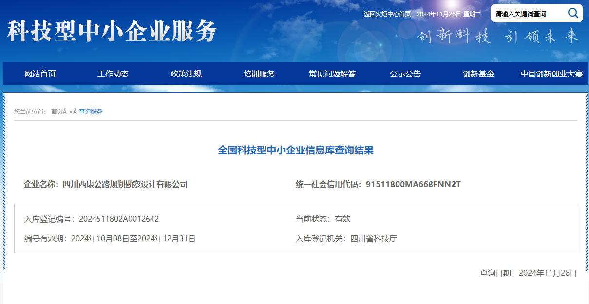 近日,四川省科學(xué)技術(shù)廳公布了本年度第五批入庫(kù)科技型中小企業(yè)名單,雅安交建集團(tuán)四川西康公路規(guī)劃勘察設(shè)計(jì)有限公司榮獲“國(guó)家級(jí)科技型中小企業(yè)”稱(chēng)號(hào),標(biāo)志著公司在科技創(chuàng)新道路上邁向了新的高度。