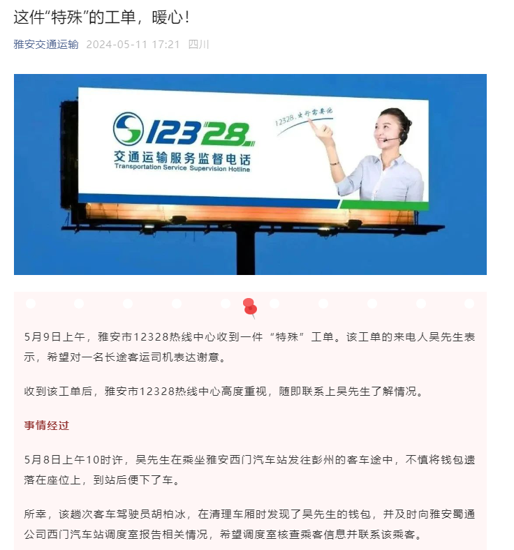 5月8日上午,乘客吳先生在乘坐蜀通公司客車時,不慎將錢包遺落在座位上。司機(jī)胡柏冰在清理車廂衛(wèi)生時發(fā)現(xiàn)了這個錢包,他立即向蜀通公司西門車站調(diào)度室匯報,并在調(diào)度室的協(xié)助下,吳先生成功取回了自己的錢包。雅安市12328熱線中心在接到吳先生的反饋后,對蜀通公司的服務(wù)和司機(jī)胡柏冰的善舉給予了高度評價,并通過雅安交通局公眾號進(jìn)行了宣傳表揚(yáng)。