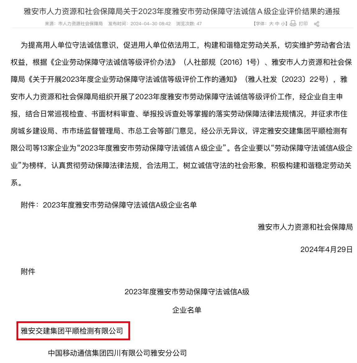 喜報!雅安交建集團(tuán)平順公司榮獲2023年度市級勞動保障守法誠信A級企業(yè)