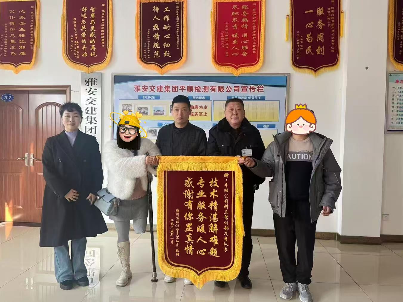 “合格了,感謝你們給予我貼心的照顧和一路陪伴,讓我順利通過(guò)考試,幫助我完成了人生中的一件大事!”近日,雅州駕校殘疾考生宋女士將一面印有“技術(shù)精湛解難題 專(zhuān)業(yè)服務(wù)暖人心 感謝有你顯真情”字樣的錦旗送到了平順公司,對(duì)工作人員為他們提供熱情、周到的服務(wù)表示感謝。