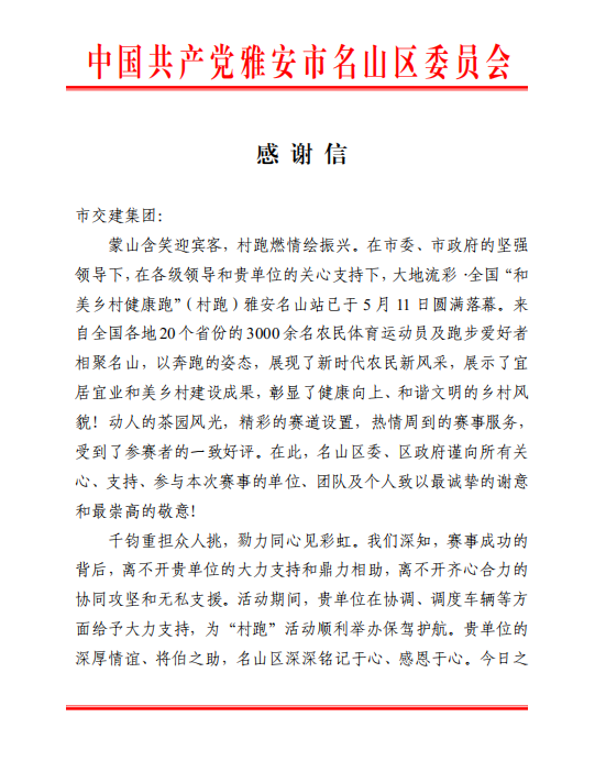 5月10日至11日,以“心向和美 逐夢茶源”為主題的大地流彩·2025年全國和美鄉(xiāng)村健康跑(村跑)雅安名山站活動在雅安市名山區(qū)成功舉辦。四川蜀通運業(yè)有限責(zé)任公司作為運輸保障單位,圓滿完成賽事期間各項運輸保障任務(wù),為活動的順利開展提供了堅實保障,受到名山區(qū)委、區(qū)政府感謝信。