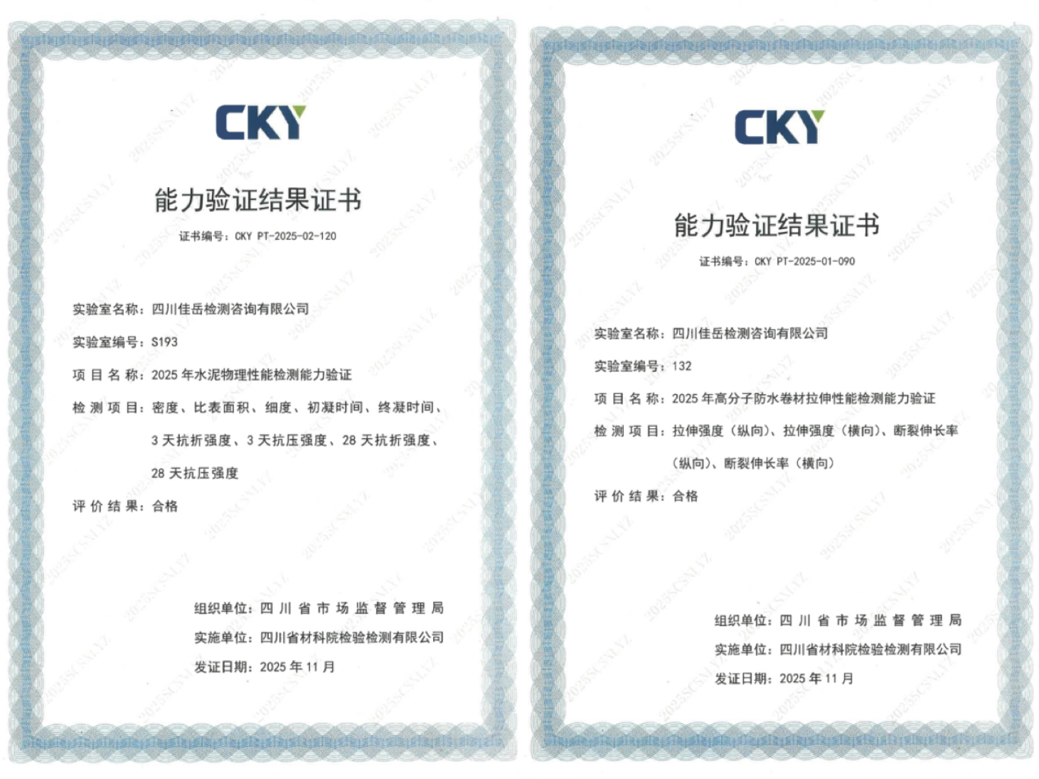 近日,佳岳公司順利完成2025年度檢測(cè)能力驗(yàn)證工作,“高分子防水卷材拉伸性能檢測(cè)”與“水泥物理性能檢測(cè)”兩項(xiàng)項(xiàng)目結(jié)果均獲“滿意”評(píng)價(jià)。