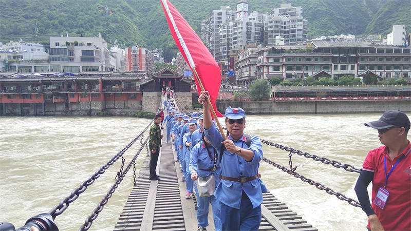 活動(dòng)中,全體黨員干部職工換上紅軍服、戴上紅軍帽,走上瀘定橋,觸摸著沾染了無數(shù)革命烈士鮮血的鐵索,瞬間將大家的思緒拉回到1935年的5月29日,22名勇士冒著敵人的槍林彈雨,攀著鐵鏈沖向?qū)Π,英勇奪下瀘定橋,取得長(zhǎng)征中的一次決定性勝利場(chǎng)景。大家無不被革命先輩的英勇與無畏所震撼。
