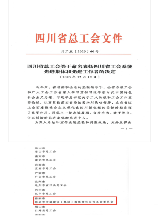 雅安市交通建設(shè)(集團)有限責(zé)任公司工會委員會榮獲“四川省工會先進(jìn)集體”