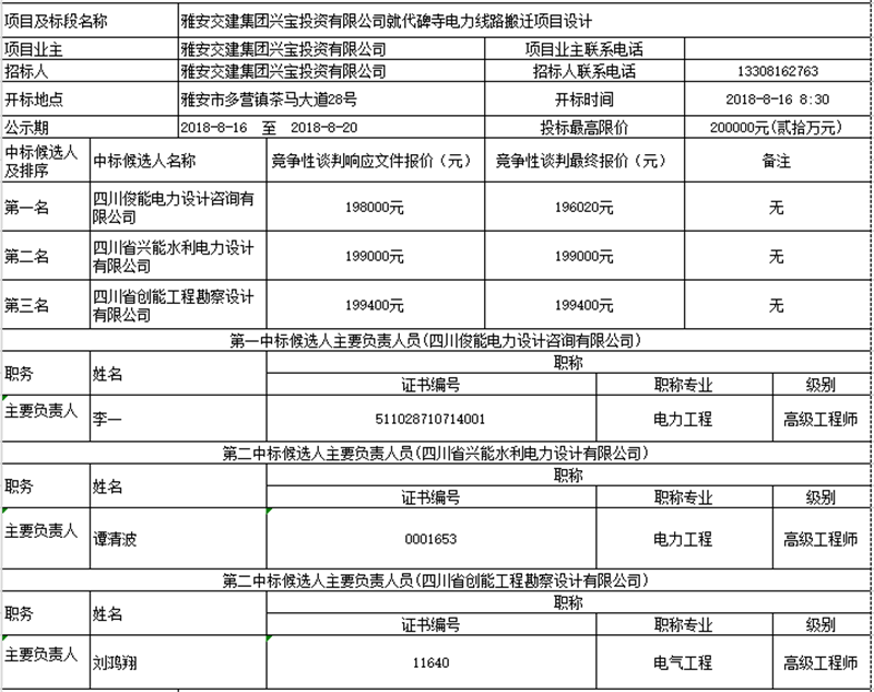 雅安交建集團興寶投資有限公司就代碑寺電力線路搬遷項目設(shè)計競爭性談判中標(biāo)候選人公示
