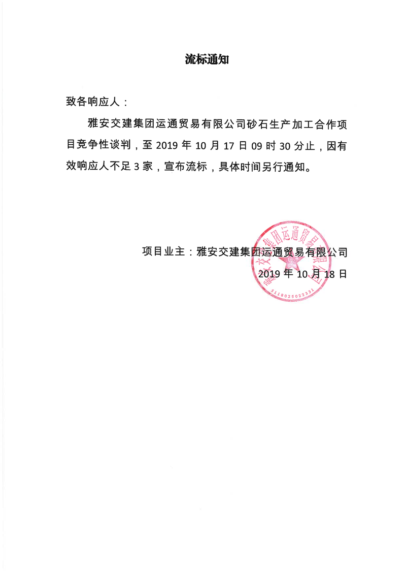 雅安交建集團運通貿(mào)易有限公司砂石生產(chǎn)加工合作項目流標(biāo)通知
