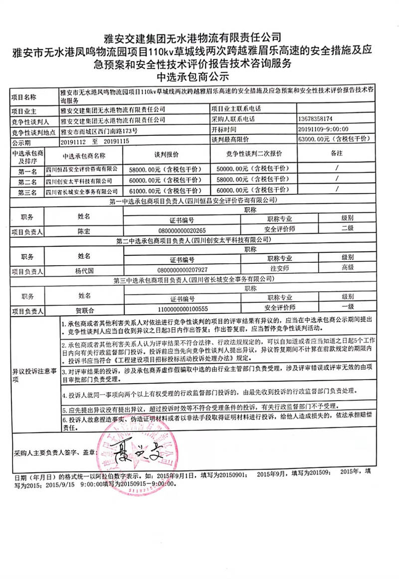 雅安交建集團(tuán)無水港物流有限責(zé)任公司雅安市無水港鳳鳴物流園項(xiàng)目110kv草城線兩次跨越雅眉樂高速的安全措施、應(yīng)急預(yù)案以及安全性技術(shù)評價(jià)報(bào)告技術(shù)咨詢服務(wù)中選承包商公示