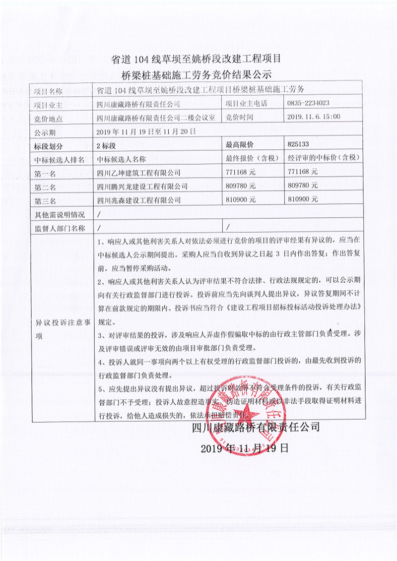四川康藏路橋有限責(zé)任公司省道104線草壩至姚橋段改建工程項目橋梁樁基礎(chǔ)施工勞務(wù)競價(2標(biāo)段)結(jié)果公示