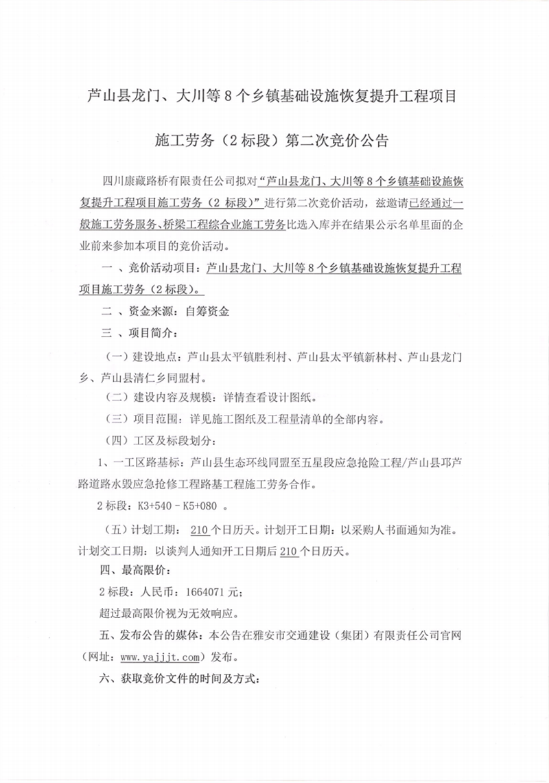 四川康藏路橋有限責(zé)任公司蘆山縣龍門、大川等8個(gè)鄉(xiāng)鎮(zhèn)基礎(chǔ)設(shè)施恢復(fù)提升工程項(xiàng)目施工勞務(wù)(2標(biāo)段)第二次競(jìng)價(jià)公告