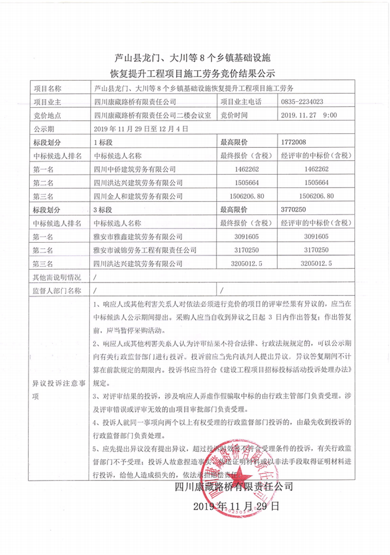 四川康藏路橋有限責(zé)任公司蘆山縣龍門、大川等8個(gè)鄉(xiāng)鎮(zhèn)基礎(chǔ)設(shè)施恢復(fù)提升工程項(xiàng)目施工勞務(wù)競(jìng)價(jià)結(jié)果公示