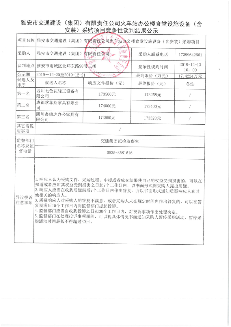 雅安市交通建設(shè)(集團)有限責(zé)任公司火車站辦公樓食堂設(shè)施設(shè)備(含安裝)采購項目競爭性談判結(jié)果公示