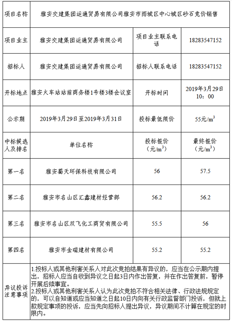 雅安交建集團運通貿(mào)易有限公司關(guān)于雅安市雨城區(qū)中心城區(qū)砂石競拍結(jié)果公示