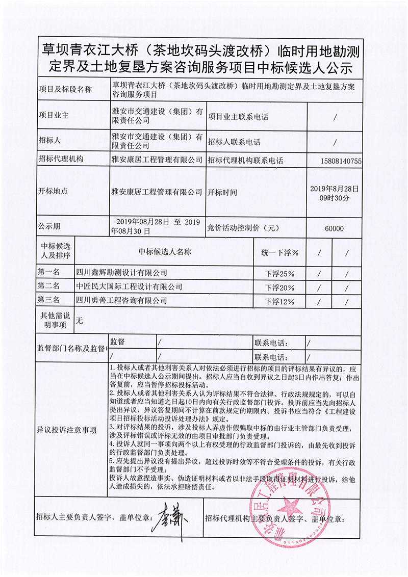雅安市交通建設(shè)(集團(tuán))有限責(zé)任公司草壩青衣江大橋(茶地坎碼頭渡改橋)臨時(shí)用地勘測(cè)定界及土地復(fù)墾方案咨詢服務(wù)項(xiàng)目競價(jià)結(jié)果公示