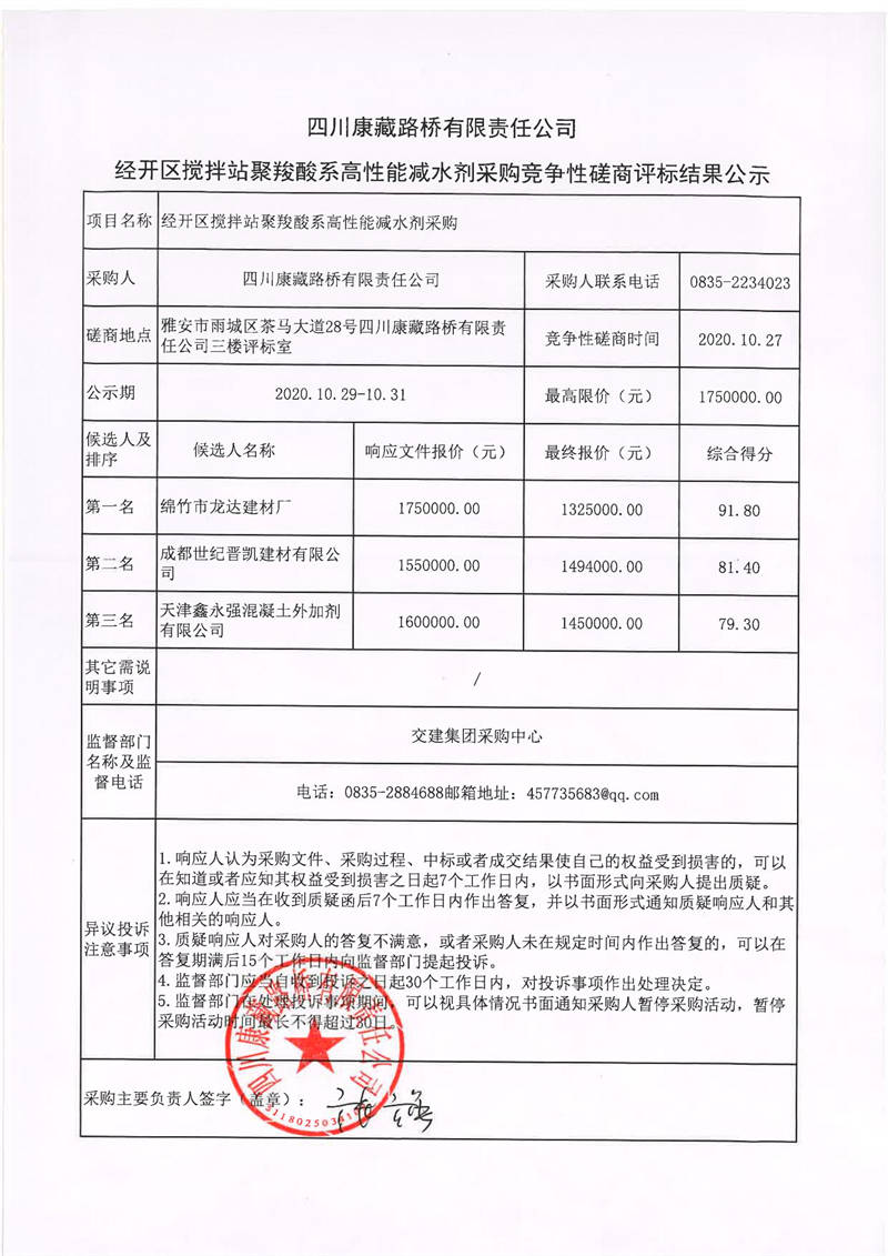 四川康藏路橋有限責(zé)任公司經(jīng)開區(qū)攪攔站聚羧酸系高性能減水劑采購競爭性磋商評標結(jié)果公示