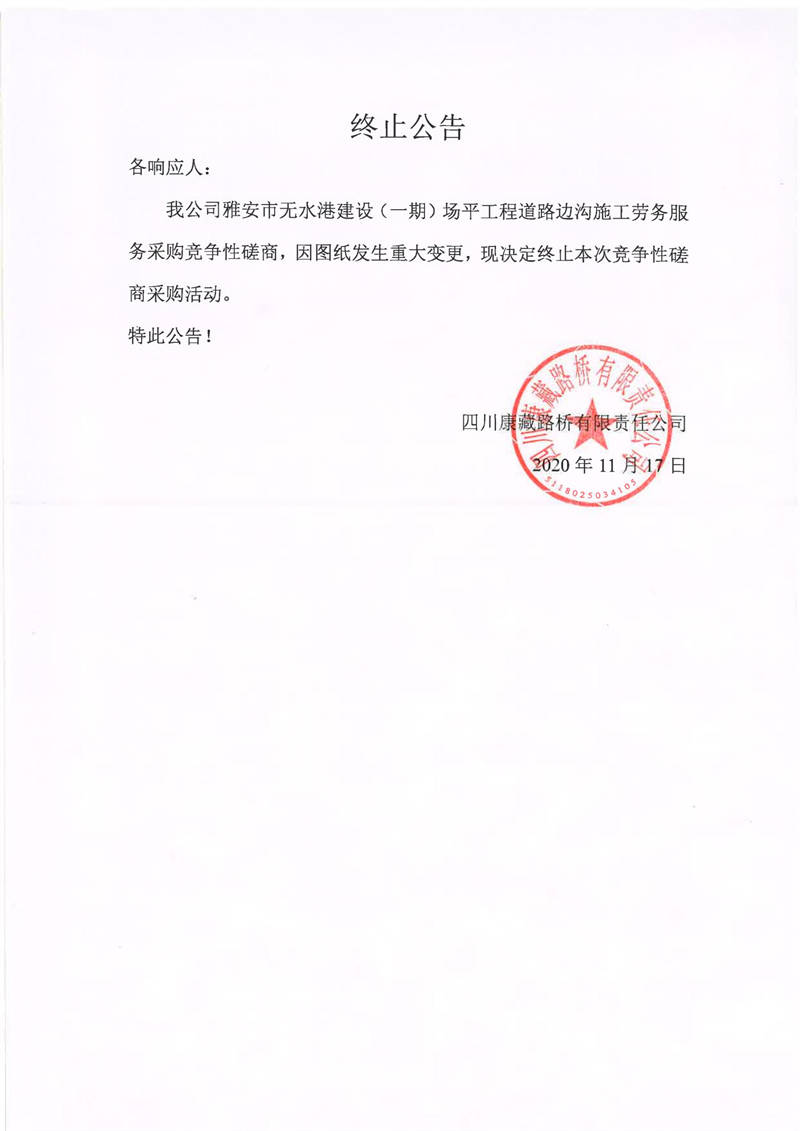 四川康藏路橋有限責(zé)任公司雅安市無水港建設(shè)(一期)場(chǎng)平工程道路邊溝施工勞務(wù)服務(wù)采購終止公告