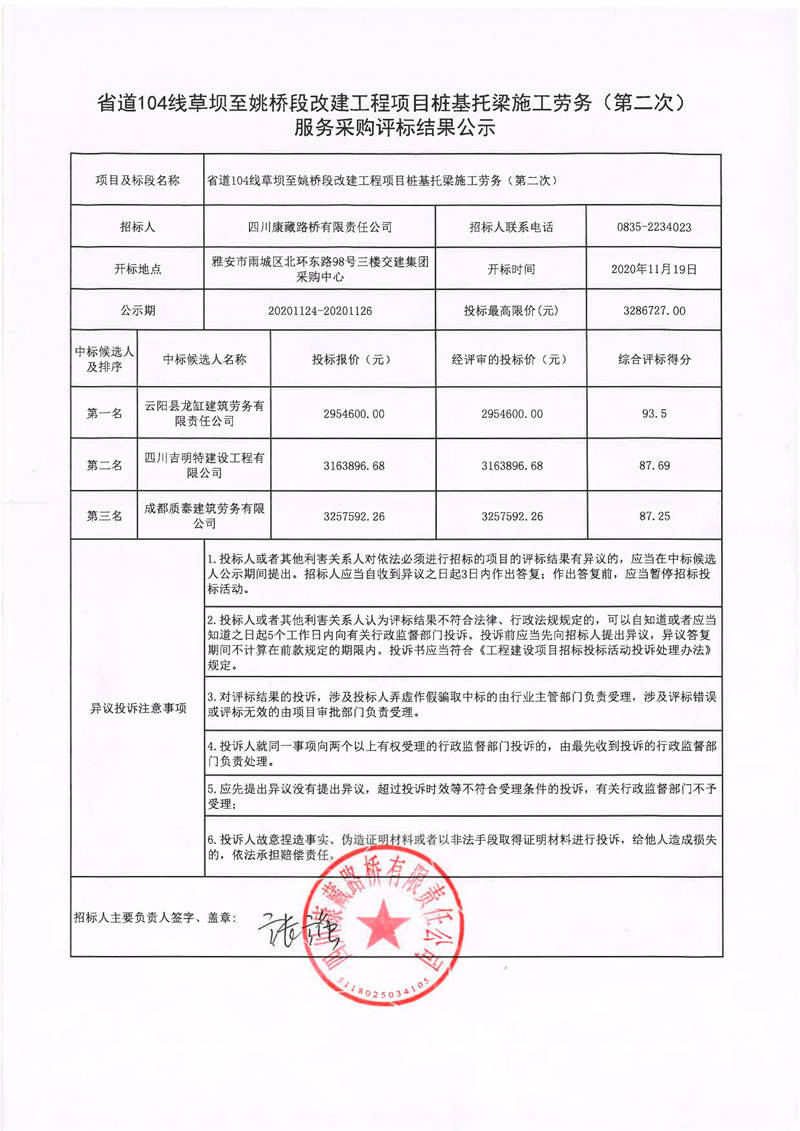 四川康藏路橋有限責(zé)任公司省道104線草壩至姚橋段改建工程項目樁基托梁施工勞務(wù)(第二次)服務(wù)采購評標(biāo)結(jié)果公示