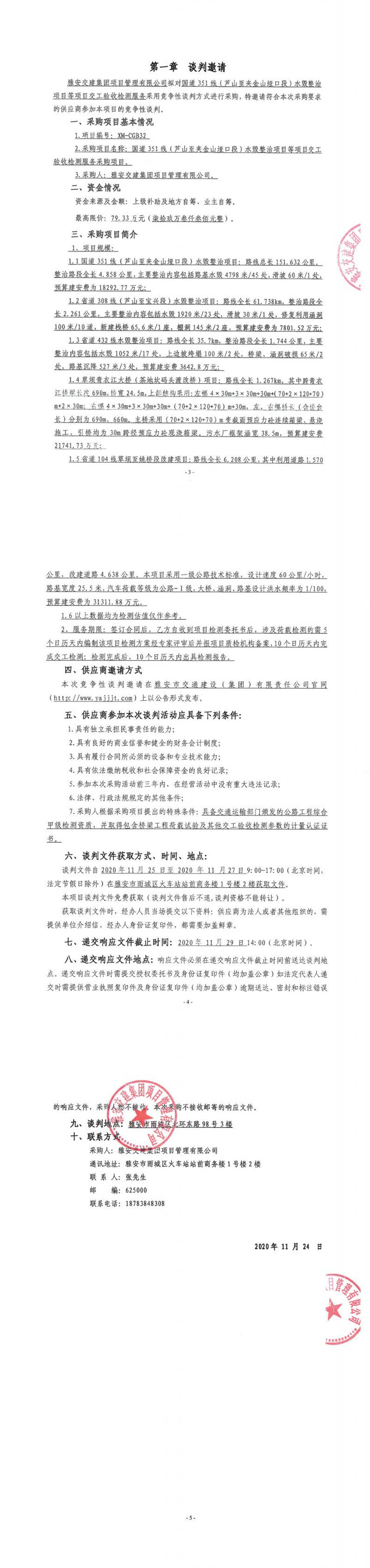 雅安交建集團(tuán)項目管理有限公司國道351線(蘆山至夾金山埡口段)水毀整治項目等項目交工驗收檢測服務(wù)采購項目競爭性談判公告