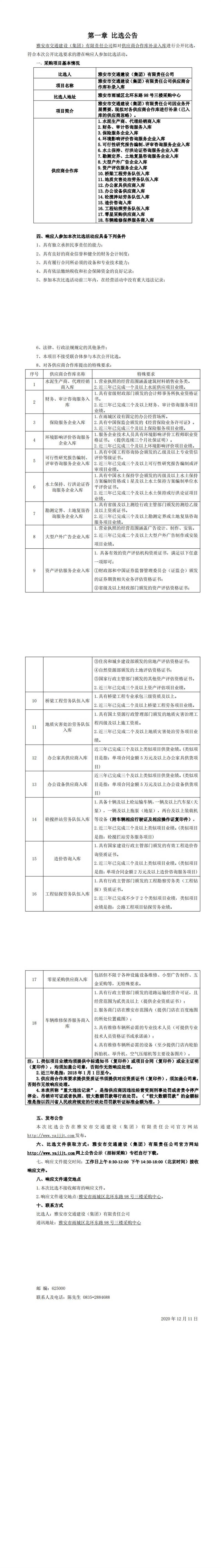 雅安市交通建設(shè)(集團(tuán))有限責(zé)任公司供應(yīng)商合作庫補(bǔ)錄入庫比選公告