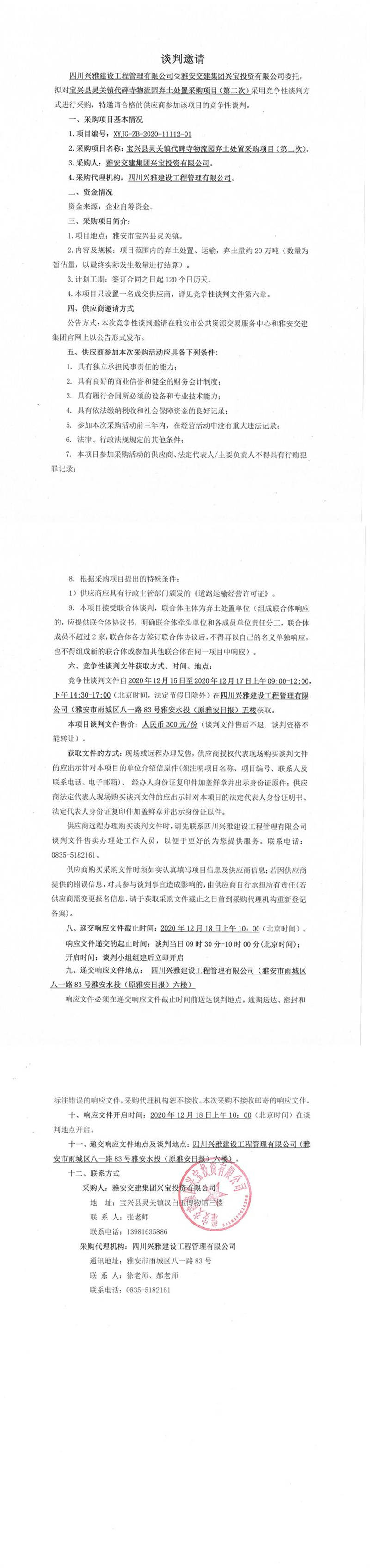 雅安交建集團興寶投資有限公司寶興縣靈關鎮(zhèn)代碑寺物流園棄土處置采購項目(第二次)談判公告
