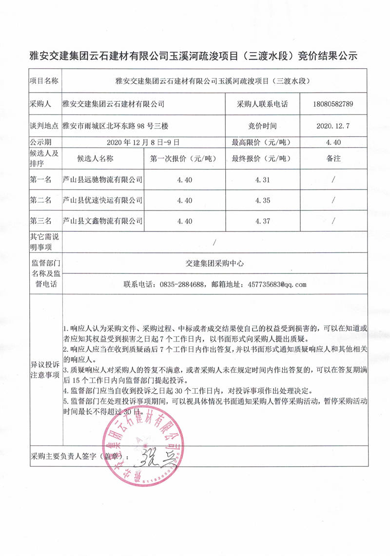 雅安交建集團(tuán)云石建材有限公司玉溪河疏浚項(xiàng)目(三渡水段)競價(jià)結(jié)果公示