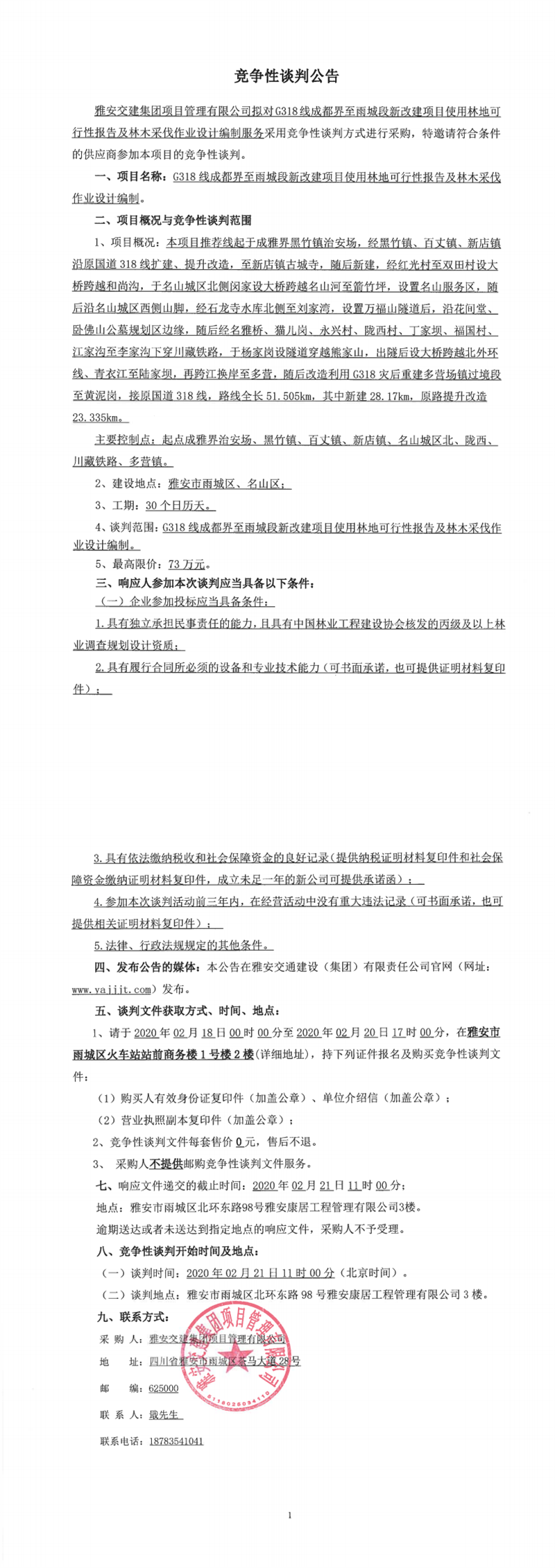 雅安交建集團(tuán)項(xiàng)目管理有限公司G318線成都界至雨城段新改建項(xiàng)目地質(zhì)災(zāi)害危險(xiǎn)性評(píng)價(jià)編制競(jìng)爭(zhēng)性談判公告