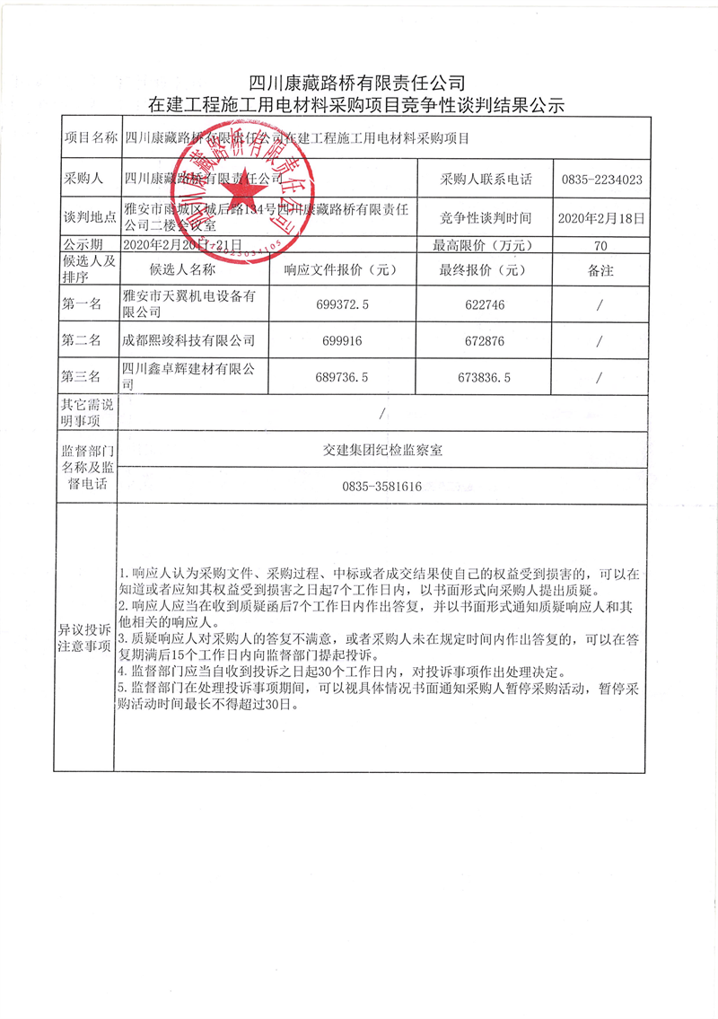 四川康藏路橋有限責(zé)任公司在建工程施工用電材料采購項目競爭性談判結(jié)果公示