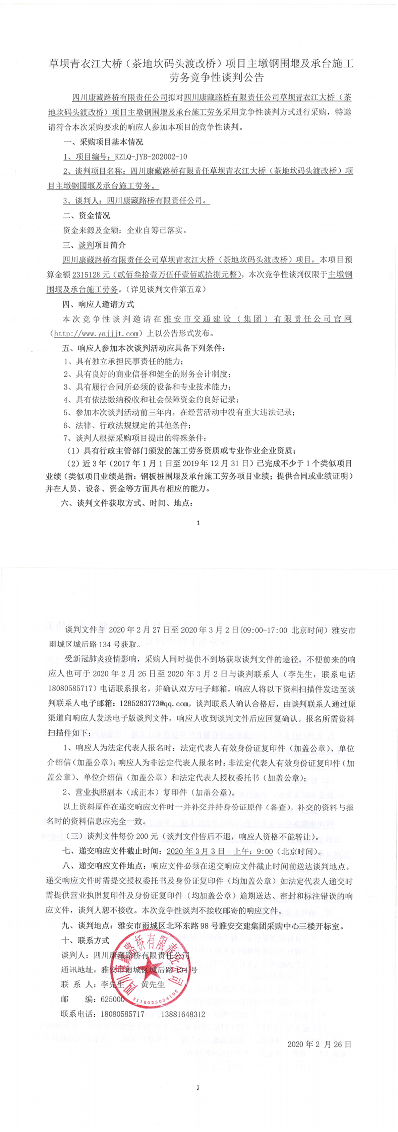 四川康藏路橋有限責(zé)任公司草壩青衣江大橋(茶地坎碼頭渡改橋)項(xiàng)目主墩鋼圍堰及承臺(tái)施工勞務(wù)競(jìng)爭(zhēng)性談判公告