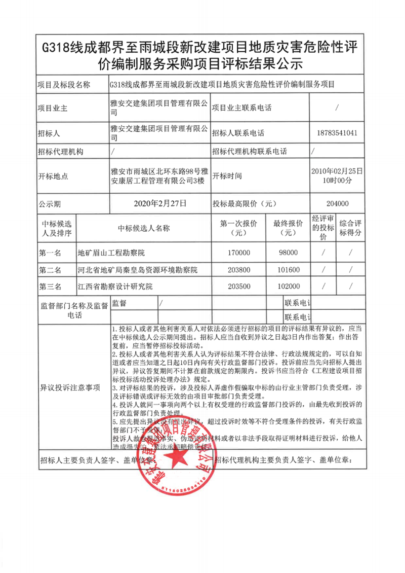 雅安交建集團項目管理有限公司G318線成都界至雨城段新改建項目地質(zhì)災害危險性評價編制服務(wù)項目評標結(jié)果公示
