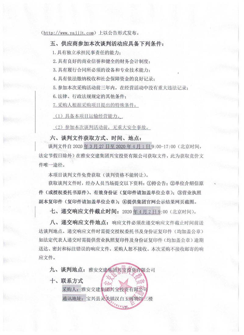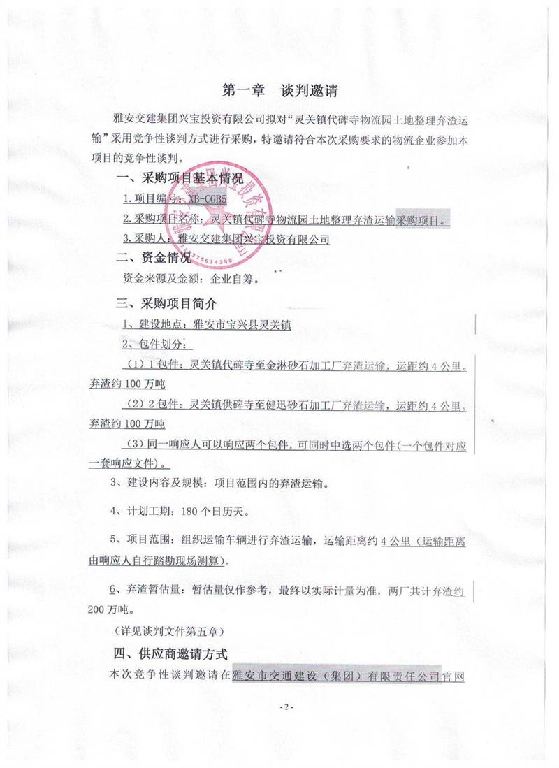 雅安交建集團(tuán)興寶投資有限公司靈關(guān)鎮(zhèn)代碑寺物流園土地整理?xiàng)壴\(yùn)輸采購項(xiàng)目競爭性談判公告