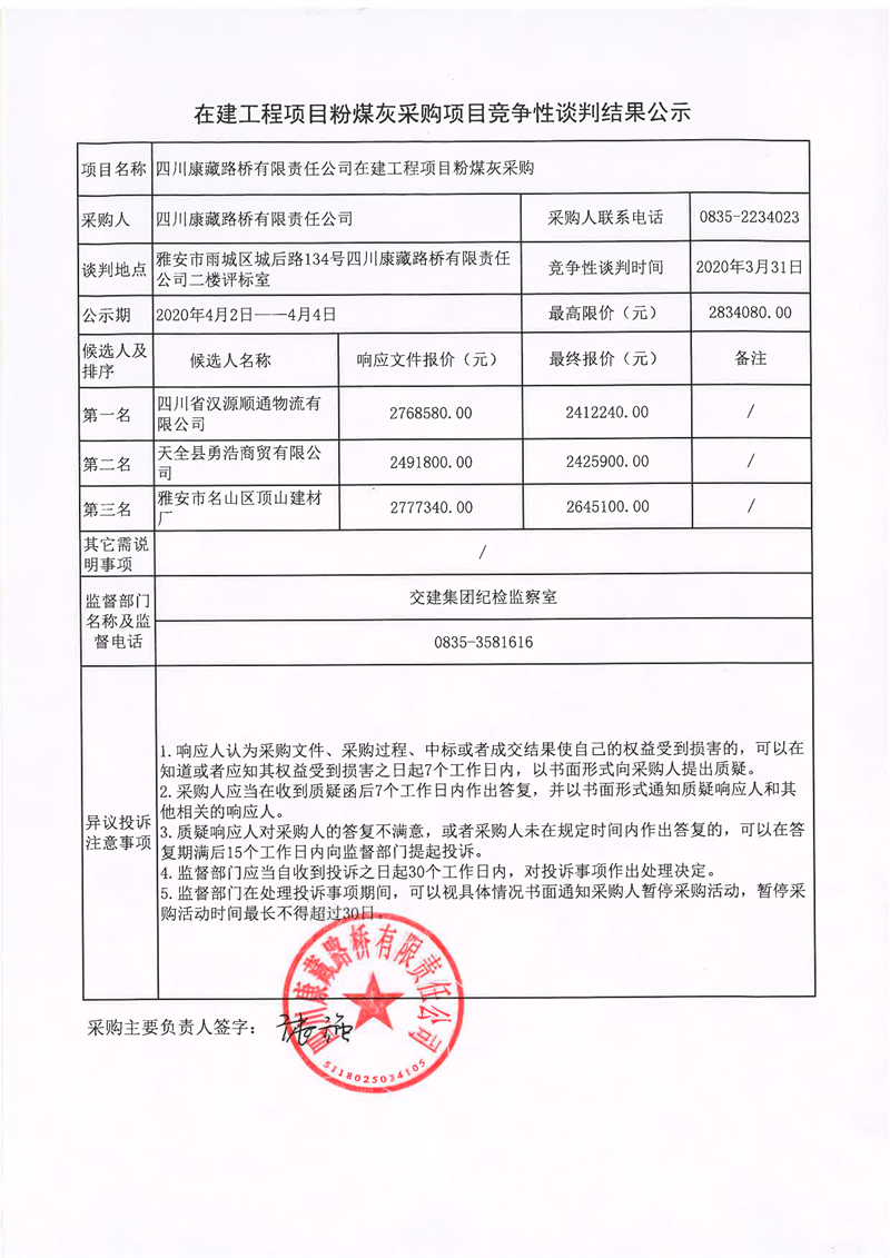四川康藏路橋有限責任公司在建工程項目粉煤灰采購項目競爭性談判結(jié)果公示