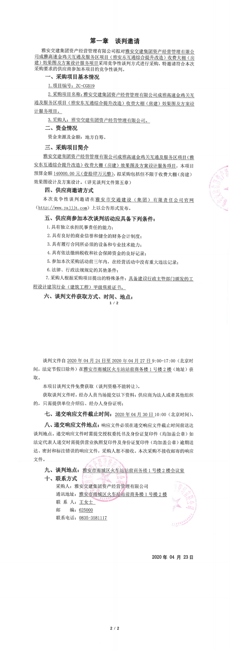 雅安交建集團(tuán)資產(chǎn)經(jīng)營管理有限公司成雅高速金雞關(guān)互通及服務(wù)區(qū)項目(雅安東互通綜合提升改造)收費(fèi)大棚(房建)效果圖及方案設(shè)計服務(wù)項目競爭性談判公告