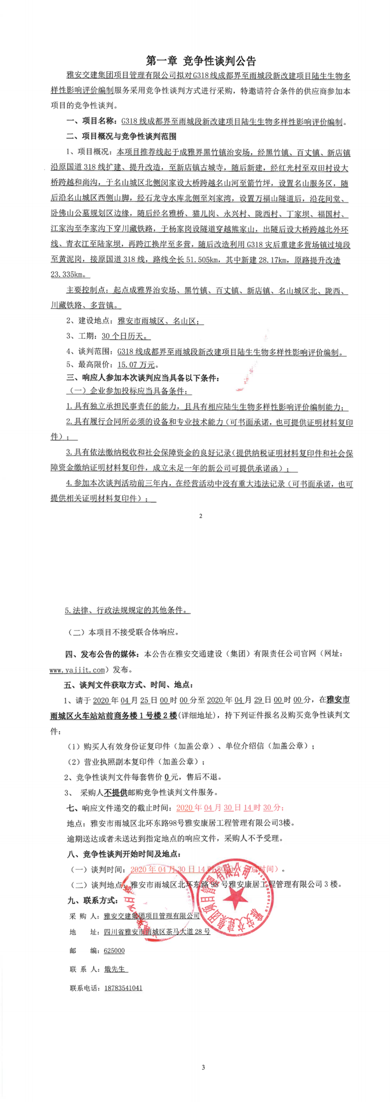 雅安交建集團(tuán)項目管理有限公司G318線成都界至雨城段新改建項目陸生生物多樣性影響評價編制競爭性談判公告