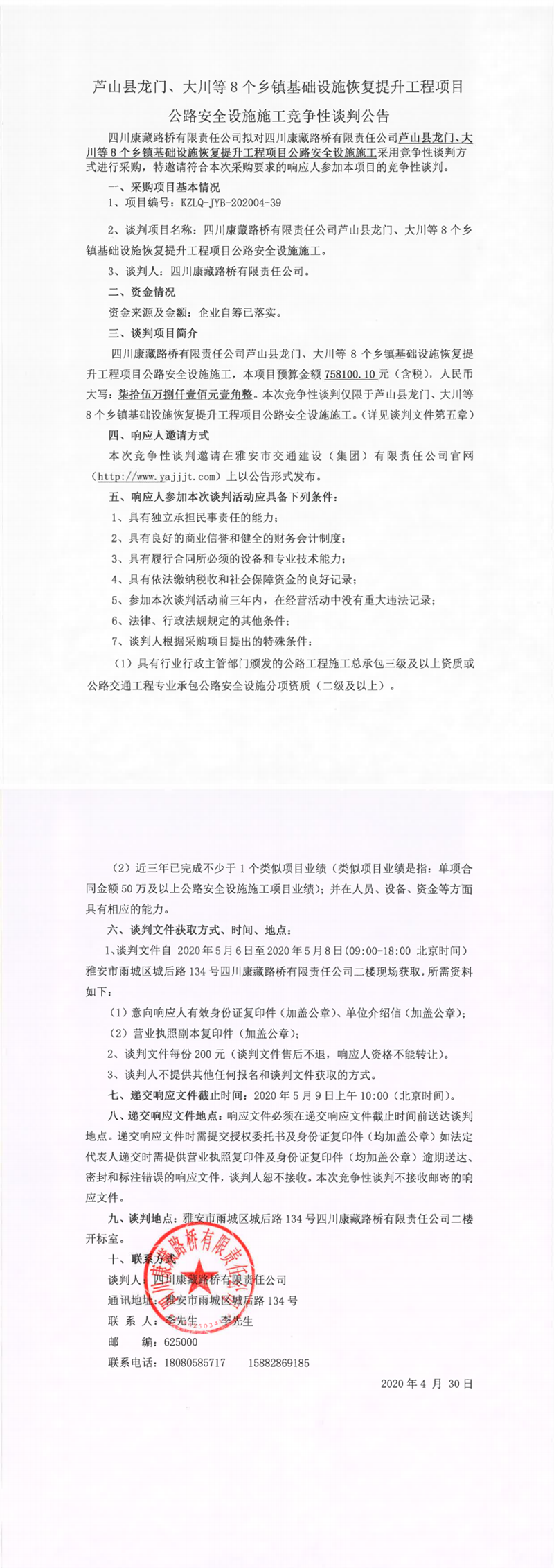 四川康藏路橋有限責(zé)任公司蘆山縣龍門、大川等8個(gè)鄉(xiāng)鎮(zhèn)基礎(chǔ)設(shè)施恢復(fù)提升工程項(xiàng)目公路安全設(shè)施施工競爭性談判公告