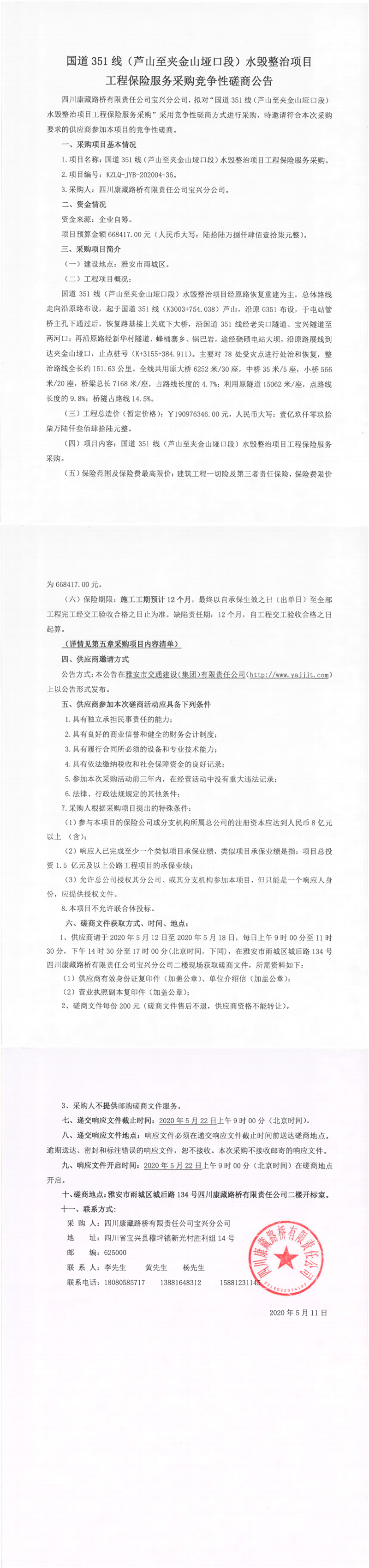 四川康藏路橋有限責任公司寶興分公司國道351線(蘆山至夾金山埡口段)水毀整治項目工程保險服務采購競爭性磋商公告