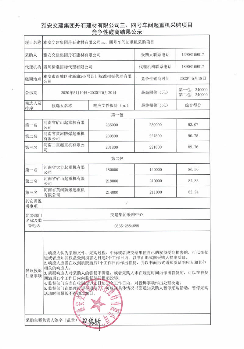 雅安交建集團(tuán)丹石建材有限公司三、四號(hào)車間起重機(jī)采購項(xiàng)目競(jìng)爭(zhēng)性磋商結(jié)果公示