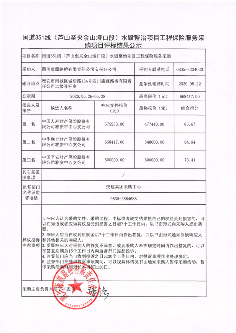 四川康藏路橋有限責(zé)任公司寶興分公司國道351線(蘆山至夾金山埡口段)水毀整治項(xiàng)目工程保險(xiǎn)服務(wù)采購項(xiàng)目評(píng)標(biāo)結(jié)果公示