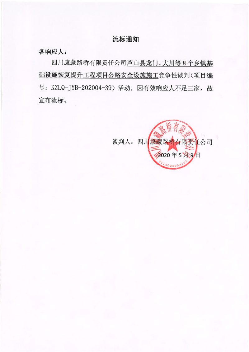 四川康藏路橋有限責(zé)任公司蘆山縣龍門、大川等8個(gè)鄉(xiāng)鎮(zhèn)基礎(chǔ)設(shè)施恢復(fù)提升工程項(xiàng)目公路安全設(shè)施施工競(jìng)爭(zhēng)性談判流標(biāo)通知