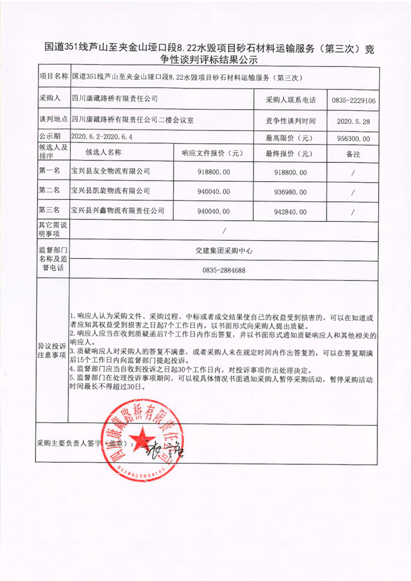 四川康藏路橋有限責任公司國道351線蘆山至夾金山埡口段8.22水毀項目砂石材料運輸服務(第三次)競爭性談判評標結(jié)果公示