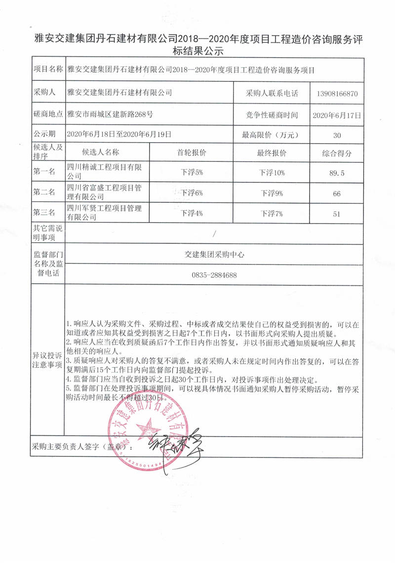 雅安交建集團丹石建材有限公司2018—2020年度項目工程造價咨詢服務評標結果公示