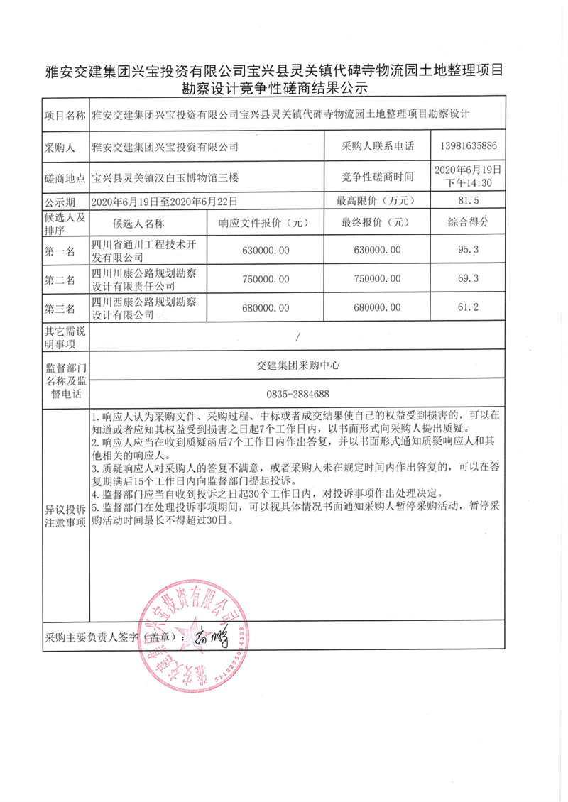 雅安交建集團興寶投資有限公司寶興縣靈關(guān)鎮(zhèn)代碑寺物流園土地整理項目勘察設(shè)計競爭性磋商結(jié)果公示
