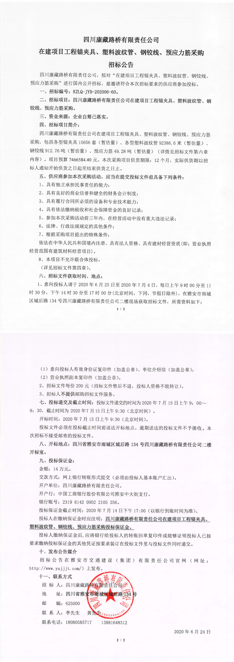 四川康藏路橋有限責(zé)任公司在建項(xiàng)目工程錨夾具、塑料波紋管、鋼鉸線、預(yù)應(yīng)力筋采購(gòu)招標(biāo)公告