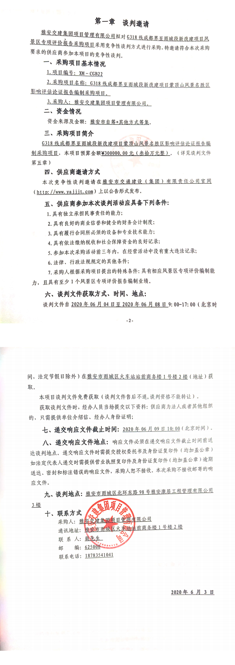 雅安交建集團項目管理有限公司G318線成都界至雨城段新改建項目蒙頂山風景名勝區(qū)影響評估論證報告編制采購項目競爭性談判公告