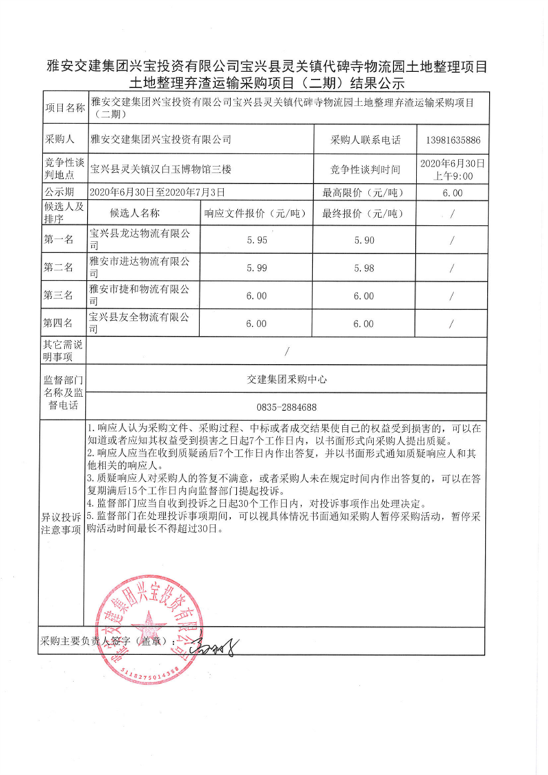 雅安交建集團(tuán)興寶投資有限公司寶興縣靈關(guān)鎮(zhèn)代碑寺物流園土地整理項(xiàng)目土地整理?xiàng)壴\(yùn)輸采購(gòu)項(xiàng)目(二期)結(jié)果公示