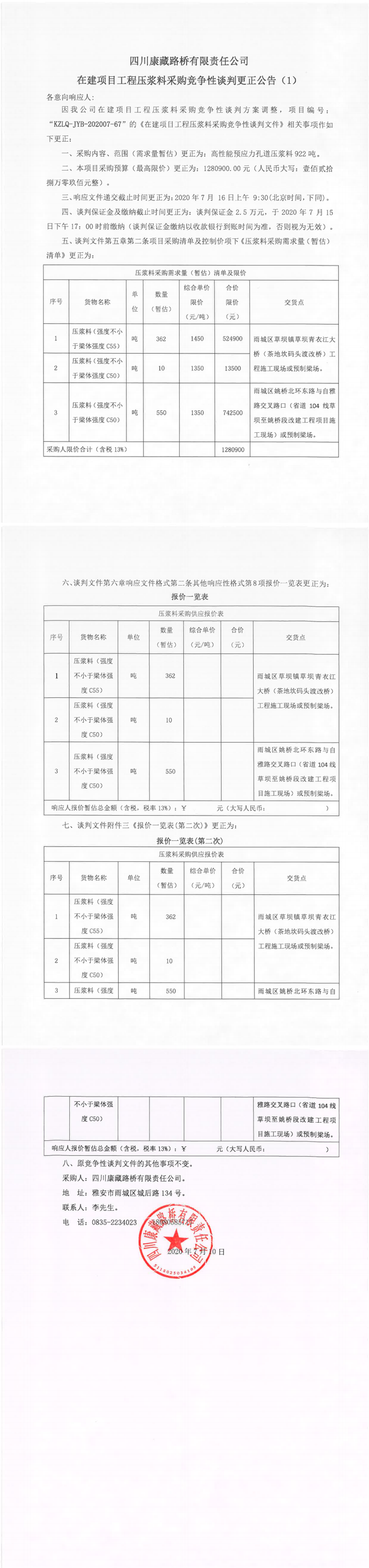 四川康藏路橋有限責(zé)任公司在建項(xiàng)目工程壓漿料采購競爭性談判更正公告(1)