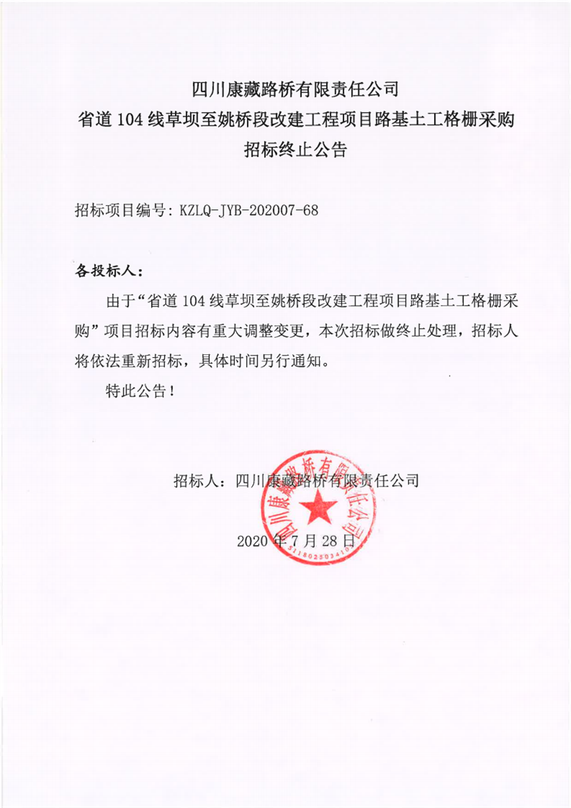 四川康藏路橋有限公司省道104線(xiàn)草壩至姚橋段改建工程項(xiàng)目路基土工格柵采購(gòu)招標(biāo)終止公告