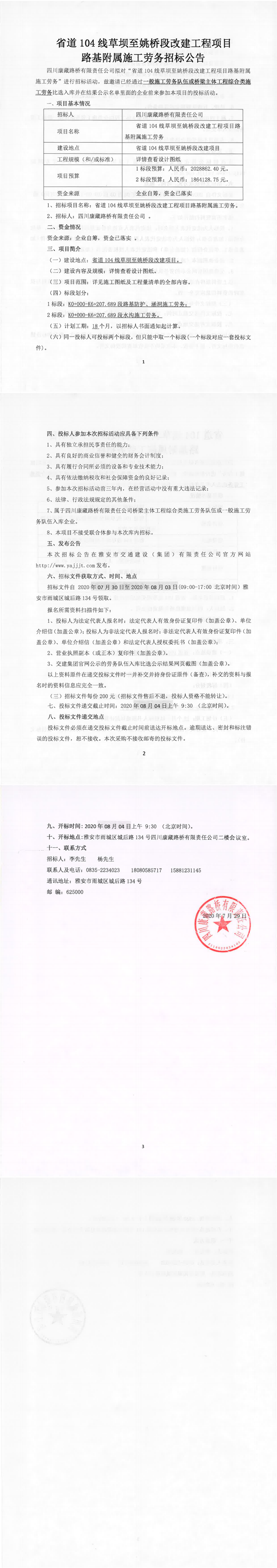 四川康藏路橋有限責(zé)任公司省道104線草壩至姚橋段改建工程項目路基附屬施工勞務(wù)招標(biāo)公告
