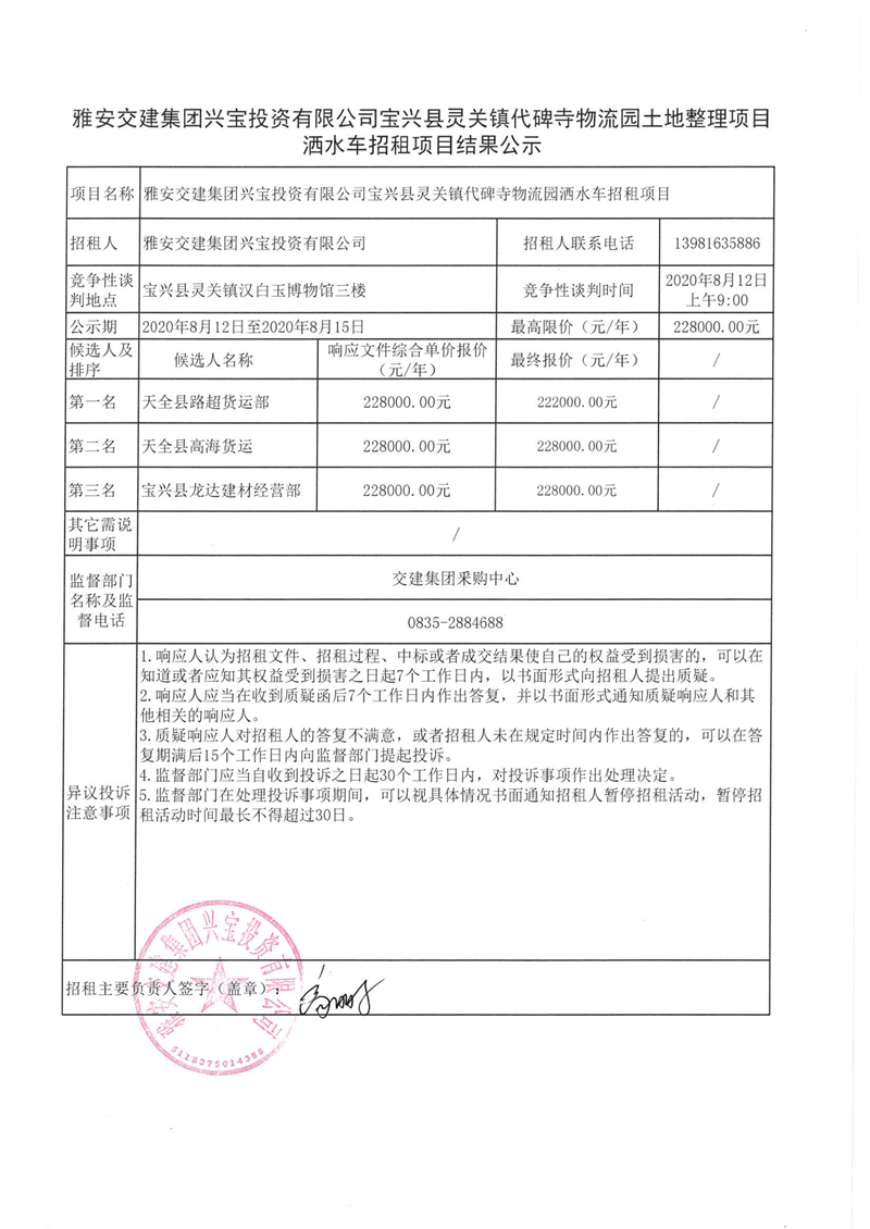 雅安交建集團興寶投資有限公司寶興縣靈關(guān)鎮(zhèn)代碑寺物流園灑水車招租項目結(jié)果公示