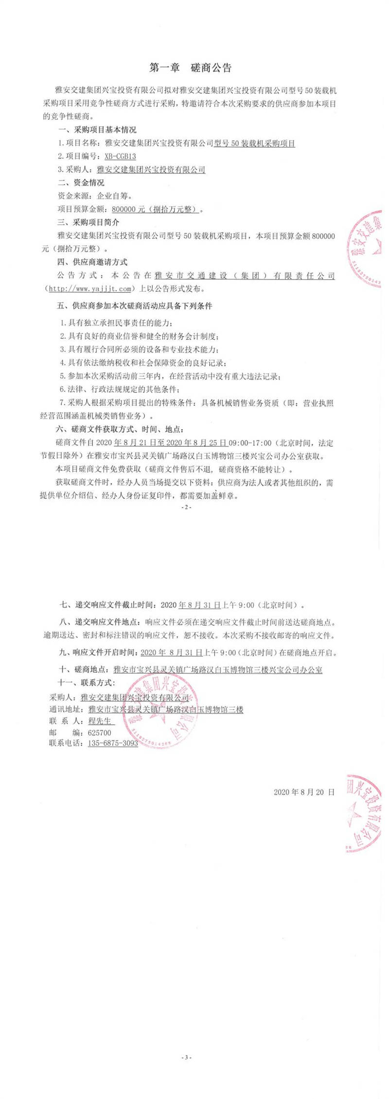雅安交建集團(tuán)興寶投資有限公司型號(hào)50裝載機(jī)采購(gòu)項(xiàng)目磋商公告