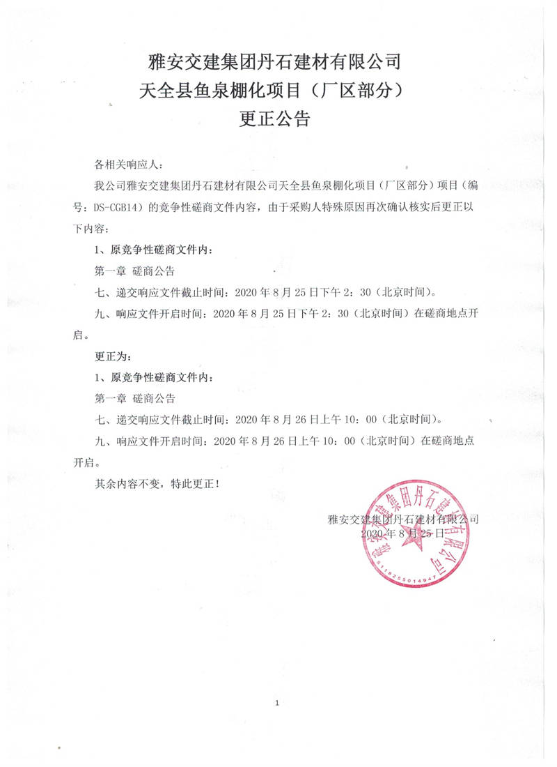雅安交建集團(tuán)丹石建材有限公司天全縣魚(yú)泉棚化項(xiàng)目(廠區(qū)部分)更正公告