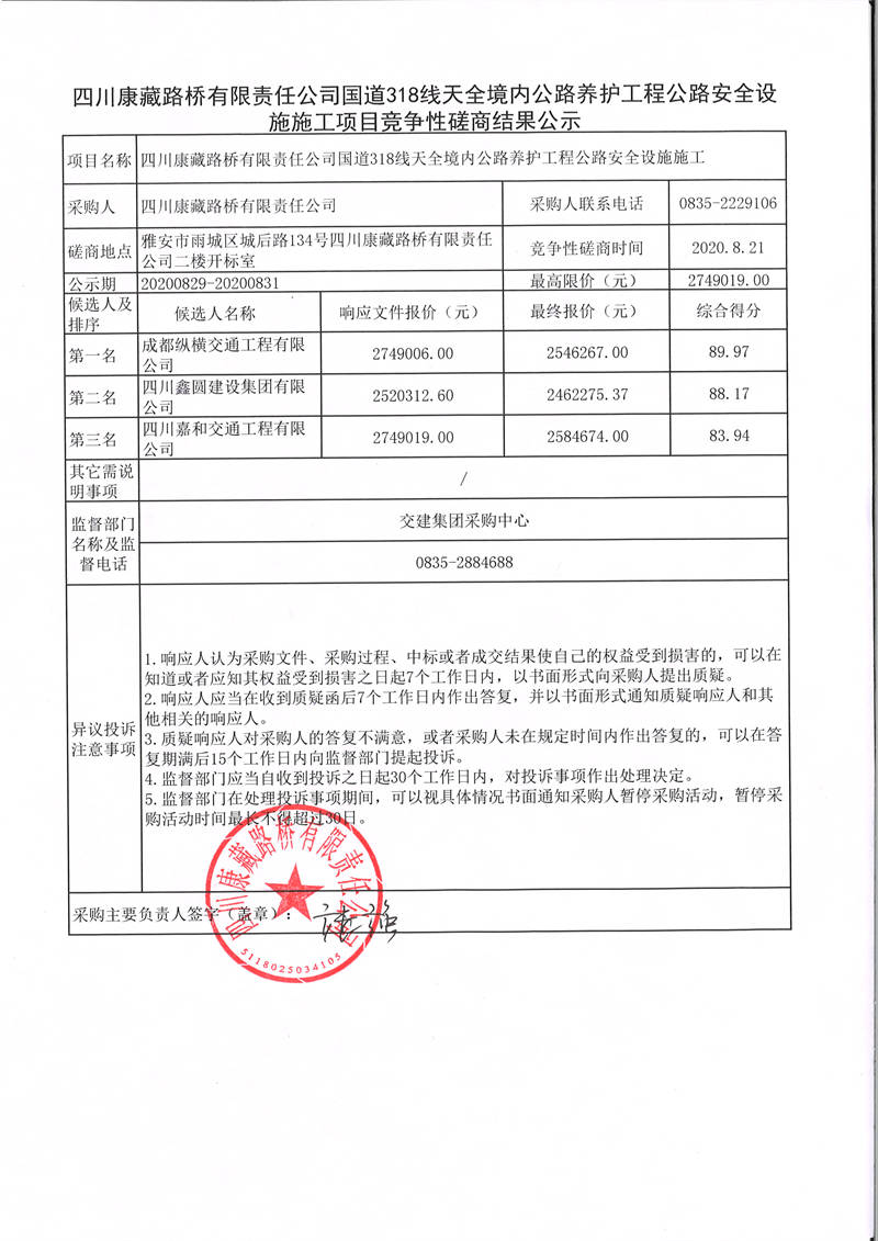 四川康藏路橋有限責(zé)任公司國(guó)道318線天全境內(nèi)公路養(yǎng)護(hù)工程公路安全設(shè)施施工項(xiàng)目競(jìng)爭(zhēng)性磋商結(jié)果公示
